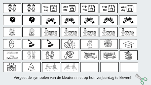 Vul de kalender in met verjaardagen, thema’s, uitstapjes en bijzondere momenten. Elke dag mogen de kleuters een kruisje zetten: zo zien ze de maand vorderen en leren ze stil te staan bij wat voorbij is en wat nog komt.