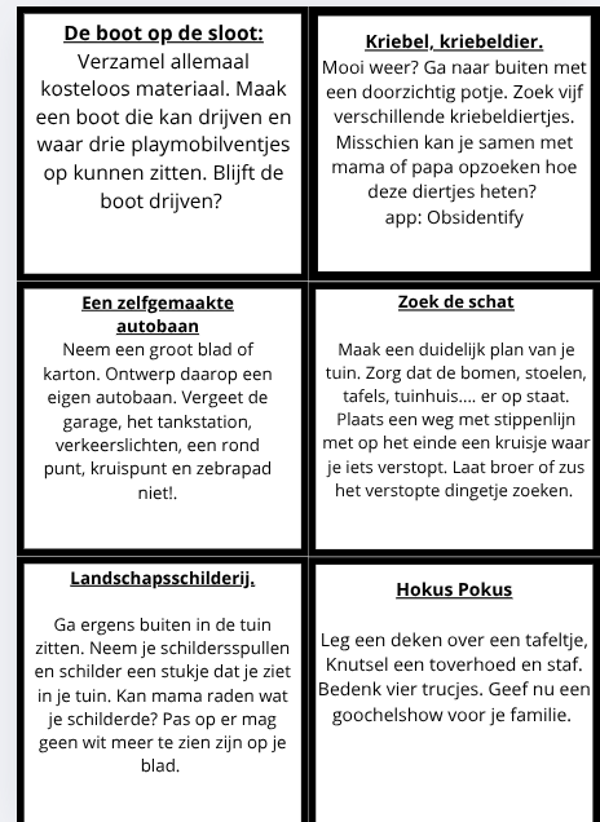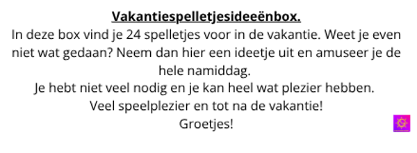 Zin in een leuke vakantie, maar weet je even niet wat gedaan? Geen nood! In deze ideeënbox vind je 24 speelse, eenvoudige én verrassende spelletjes die perfect zijn voor thuis of op vakantie.
