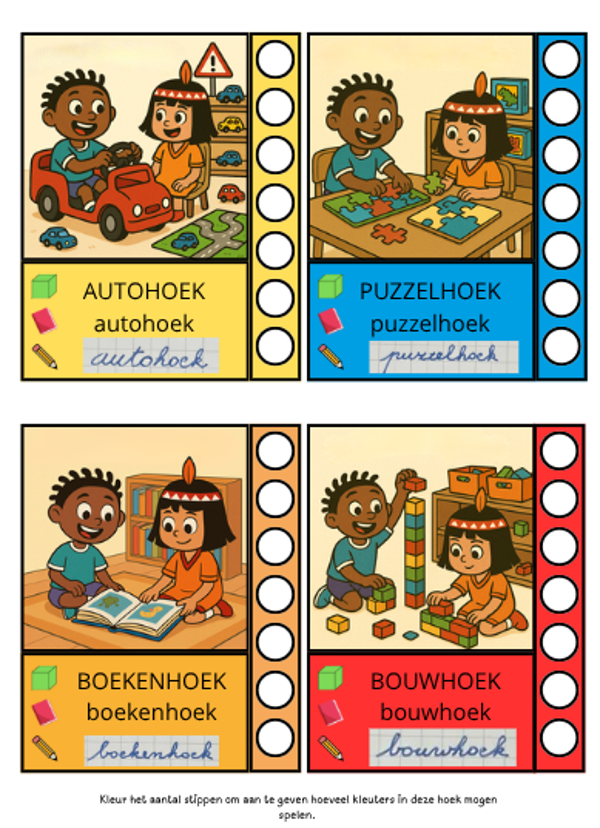 ✅ Beperk het aantal kleuters per hoek – de kaartjes tonen in één oogopslag hoeveel kinderen er mogen spelen. (Voor wie dit wenst natuurlijk!)